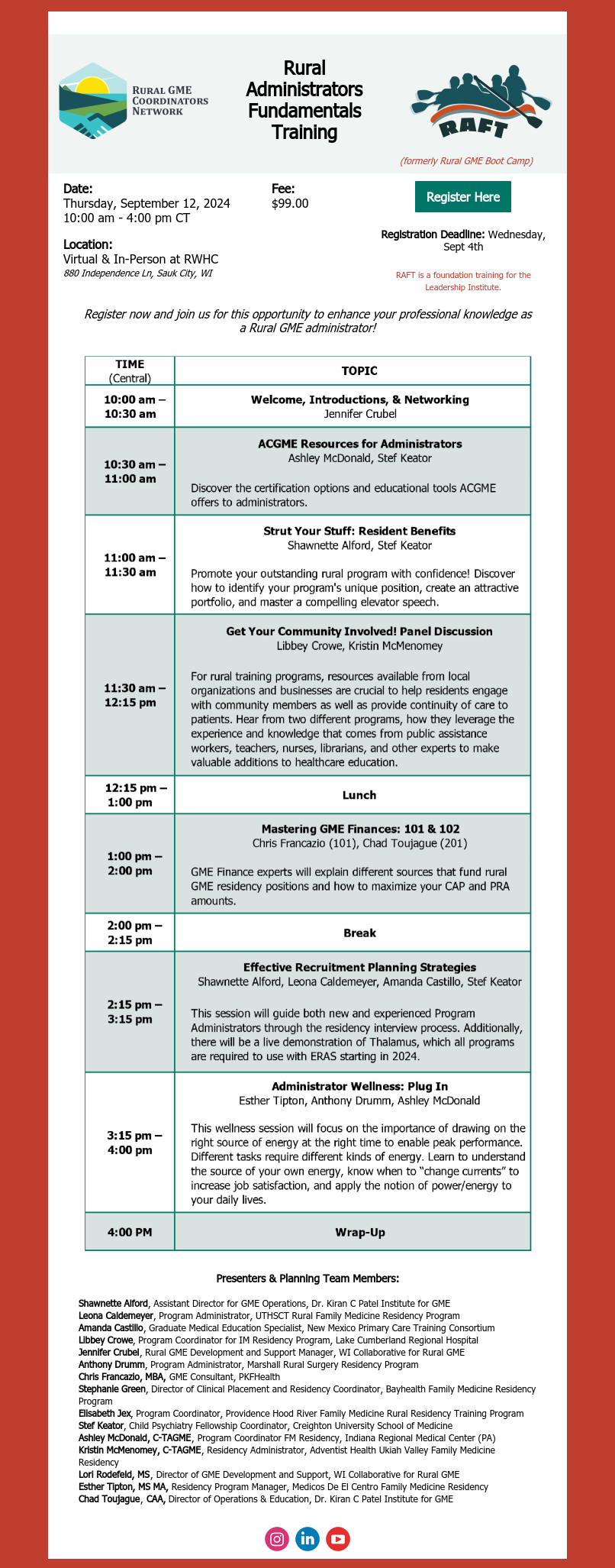 Rural Administrators Fundamentals Training - RAFT (formerly Rural GME Boot Camp) - Held annually, join us on Thursday, September 12, 2024 from 10:00am - 4:00pm CT to enhance your professional knowledge as a RURAL GME coordinator! To learn more and view the agenda, click HERE. To register, click HERE.
