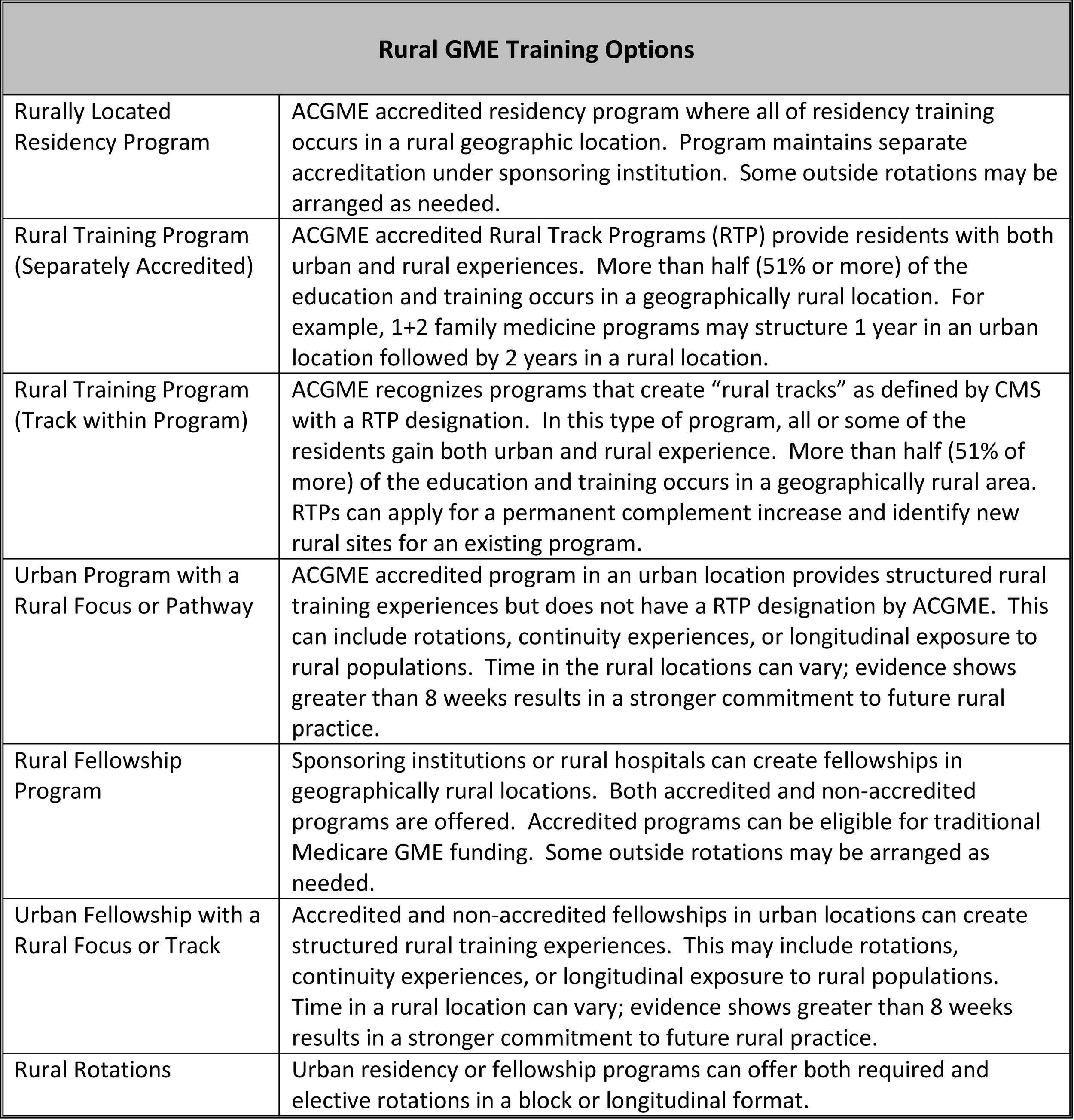 A rural residency program is an accredited graduate medical education program in which trainees spend a majority of their time (more than 50%) in a rural place. Programs can be rurally located, structured to provide a combination of rural and urban experiences (Rural Training Programs or RTPs), or may exist as an expansion of an urban program.